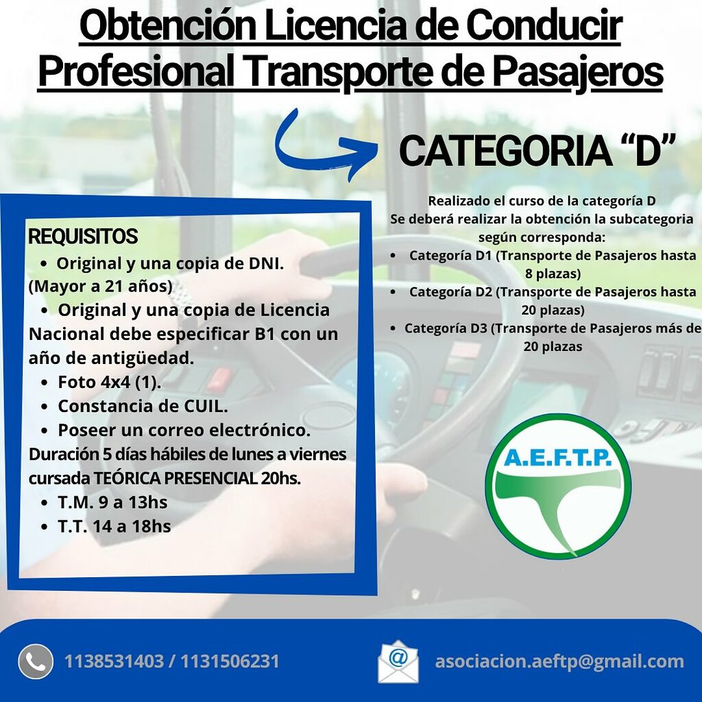 3) LICENCIA NACIONAL DE CONDUCIR (L.N.C) : Deberá especificar que corresponde a transporte de pasajeros CATEGORIAS D1-D2-D3-D22 según corresponda